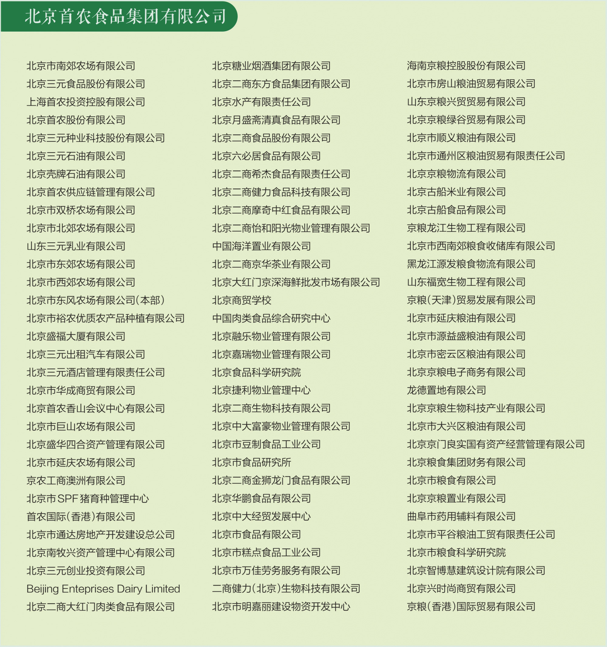 北京首農食品集團是經北京市委、市政府批準,于2017年12月由首農集團、京糧集團、二商集團三家市屬企業聯合重組成立的。集團資產、營收雙超千億,員工近6萬人,所屬企業500余家,其中中外合資合作企業30余家,境外公司10余家,上市公司2家,農業產業化國家重點龍頭企業 8 家,位列中國企業500強,是首都食品供應保障服務的重要載體。集團產業橫跨農牧漁業、食品加工業、商貿服務與物產物流業,覆蓋米面油、肉蛋奶、醬醋茶、糖酒菜等全品類食品,涉及種植、養殖、倉儲、加工、貿易、配送、銷售等各個環節,形成從田間到餐桌的全產業鏈條和一二三產融合發展的全產業格局。