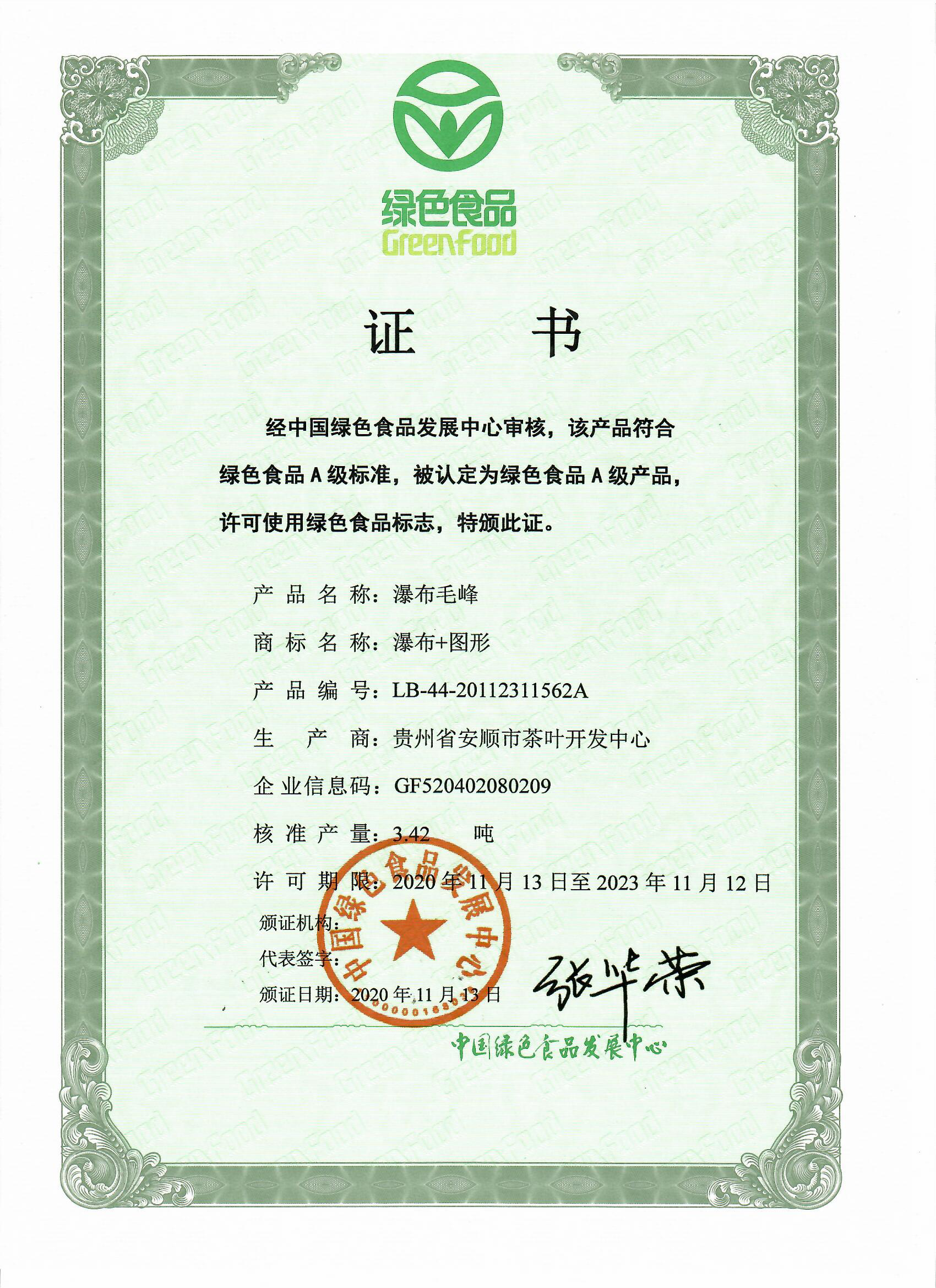 發證機構:   中國綠色食品發展中心 發證時間 :   2020-11-13