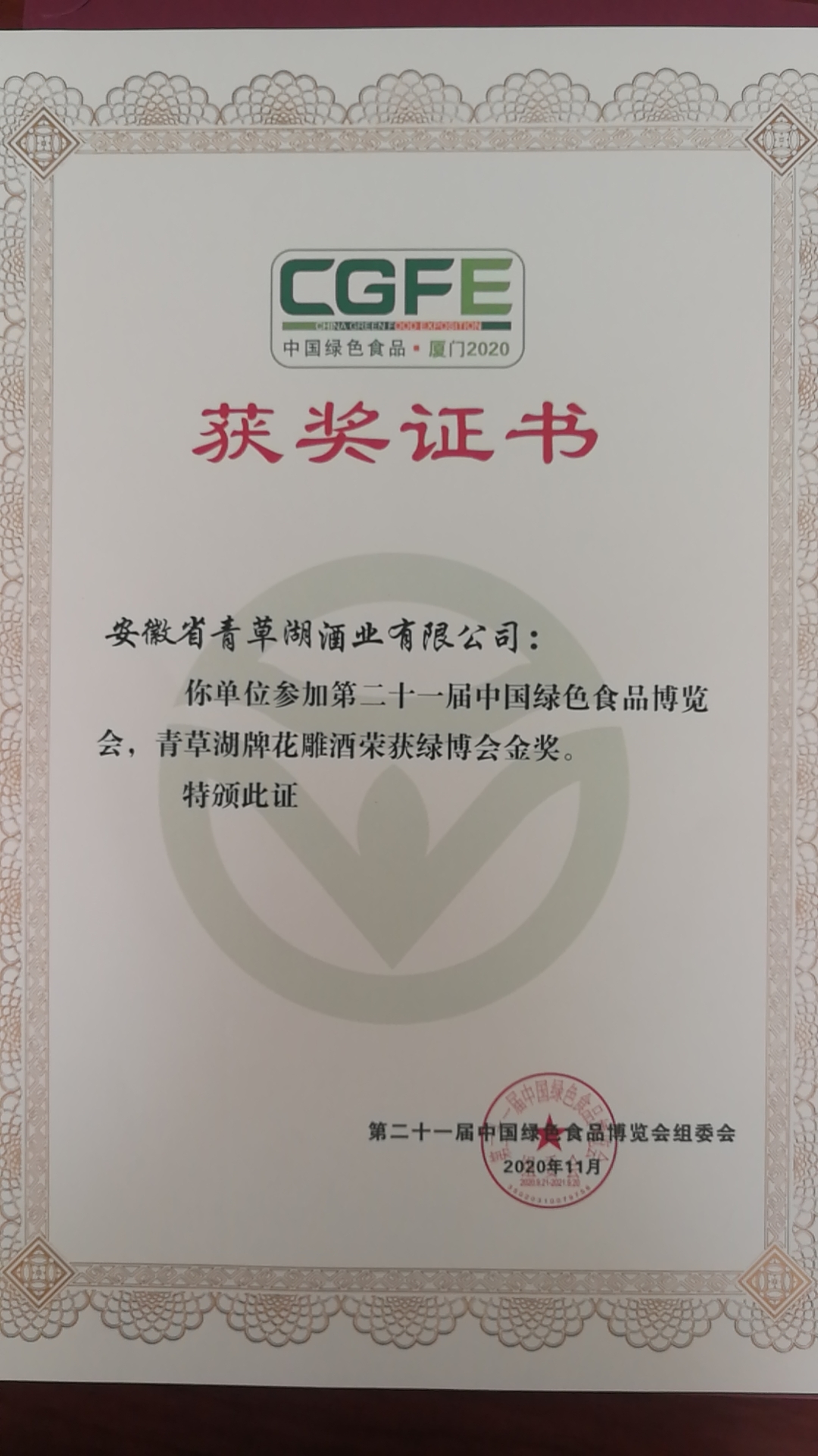 首頁 > 榮譽資質 > 中國綠色博覽會青草湖牌花雕酒榮獲綠博會金獎