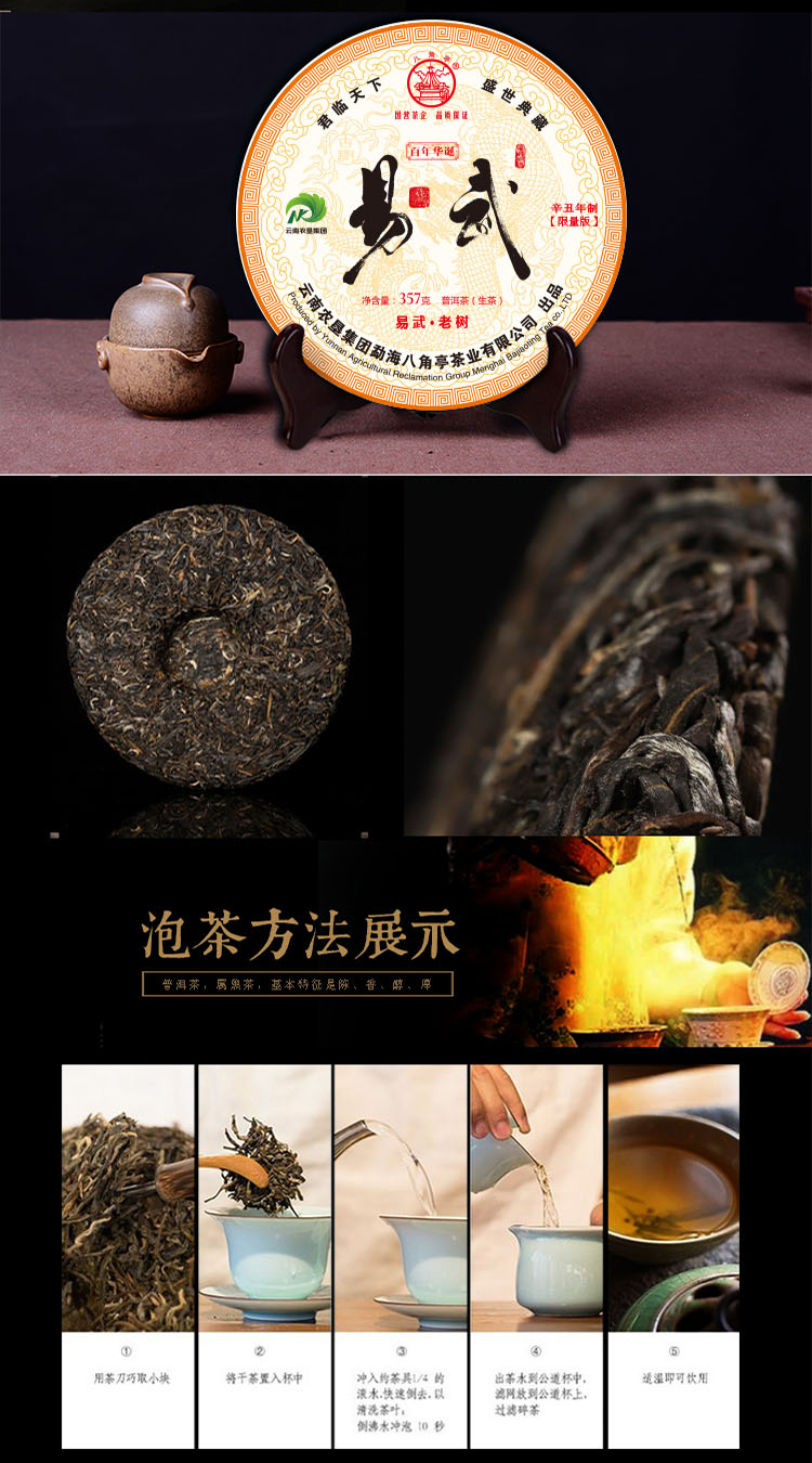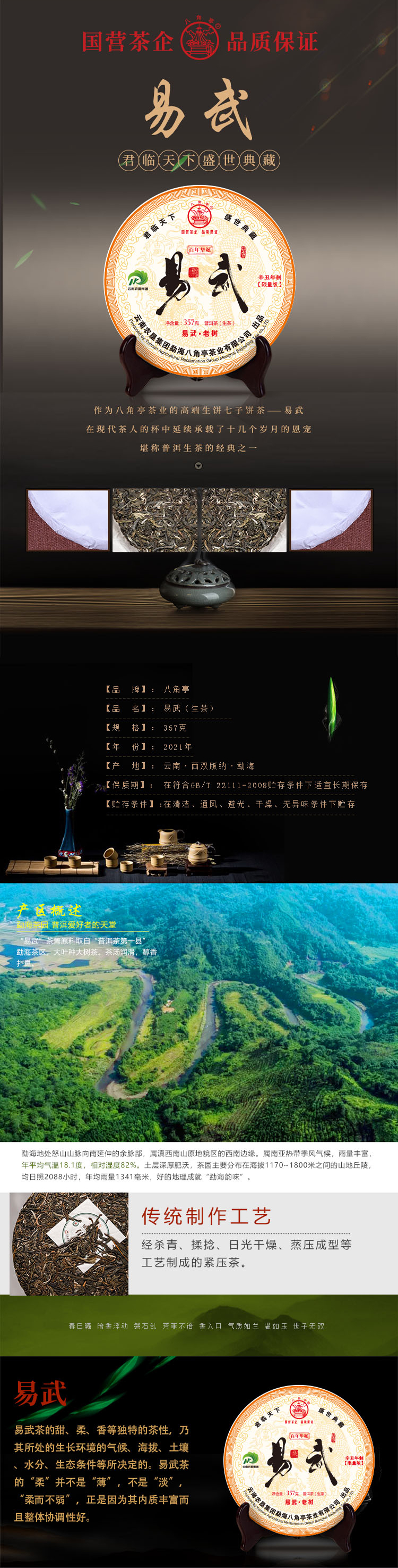 ??——八角亭茶業(yè)公司:經(jīng)營方式為生產(chǎn)加工、銷售,主營普洱茶、緊壓茶、兼營毛茶收購。目前以生產(chǎn)、加工、銷售“八角亭”系列普洱茶為主,是云南省農業(yè)產(chǎn)業(yè)化龍頭企業(yè)。“八角亭”商標獲得云南省著名商標,“八角亭”牌普洱茶榮獲云南省名牌產(chǎn)品和云南省名牌農產(chǎn)品。已先后通過工業(yè)生產(chǎn)許可證、ISQ9001與HCCP認證、云茶牌認證(YC)等項工作,在歷次專業(yè)評比中“八角亭”普洱茶多次獲得特等金獎和金獎。2017年5月,“八角亭”牌老班章茶葉獲得了有機茶資格認證。八角亭茶業(yè)公司多次進行了技術改造,現(xiàn)已建立了標準化生產(chǎn)車間和設備,年設計生產(chǎn)量達3000噸,是整個公司的主體核心企業(yè)。