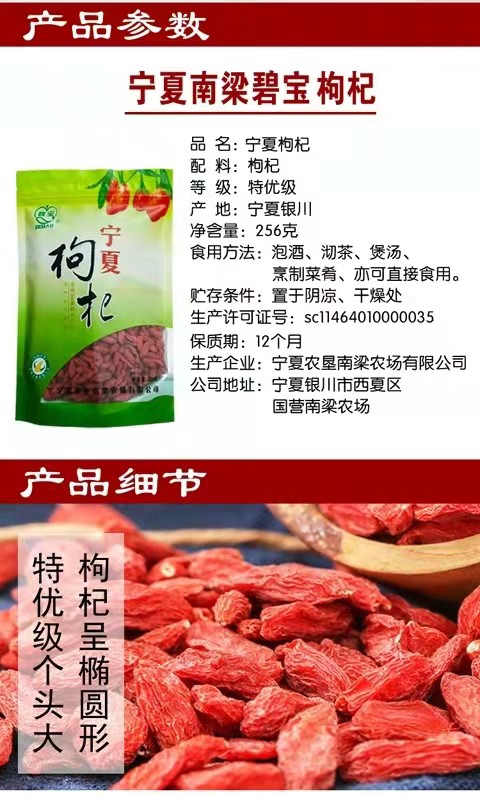 寧夏農墾南梁農場有限公司成立于1992年10月,隸屬于寧夏農墾集團有限公司,是集科研、開發、種植、生產、加工、銷售為一體的自治區級農業產業化龍頭企業。南梁枸杞已有50多年的栽培歷史,所產枸杞以粒大、肉厚、籽少、味甜、藥效高而享譽全國。 南梁農場枸杞基地先后被國家、自治區確立為“萬畝優質富硒枸杞生產基地”,“農業部無公害農產品示范基地農場”,“全國農業標準化示范基地”,“自治區農業產業化重點龍頭企業”等稱號。公司主要產品為“碧寶牌” SOD富硒枸杞、“南梁”牌枸杞。主導產品“碧寶牌” SOD富硒枸杞獲得國家專利和綠色食品證書,多次獲得中國農業博覽會金獎、馬來西亞國際金獎、兩屆中國專利新技術新產品博覽會金獎在內的多項國際國內金獎。