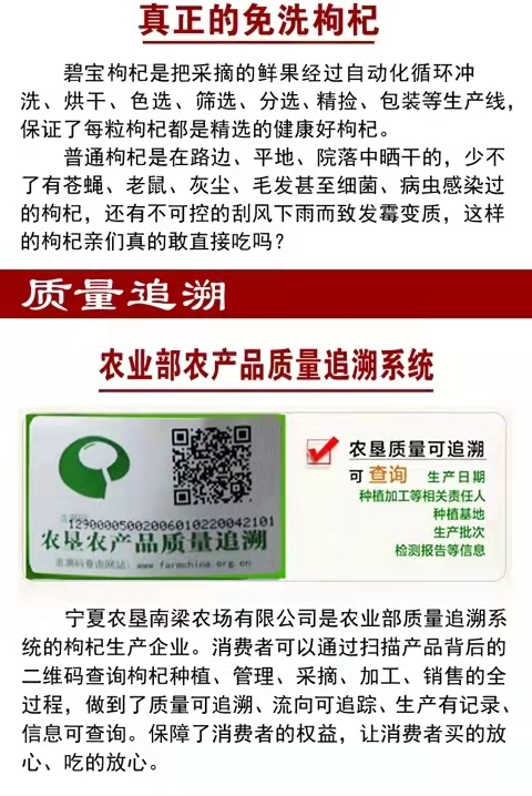 公司枸杞基地先后被國家、“全國農業標準化示范基地”,“自治區農業產業化重點龍頭企業”等稱號。是農業部質量追溯產品,并獲得中國農墾首批落地背書企業,產品通過了綠色食品認證、ISO9001質量管理體系認證,HACCP(危害分析與關鍵控制點)管理體系認證和GAP中國良好農業規范認證。公司主要產品為“碧寶牌” “南梁”牌枸杞。主導產品“碧寶牌” 多次獲得中國農業博覽會金獎、馬來西亞國際金獎、兩屆中國專利新技術新產品博覽會金獎在內的多項國際國內金獎,并連續獲得第十四屆、十五屆、十六屆國際農產品交易會金獎。